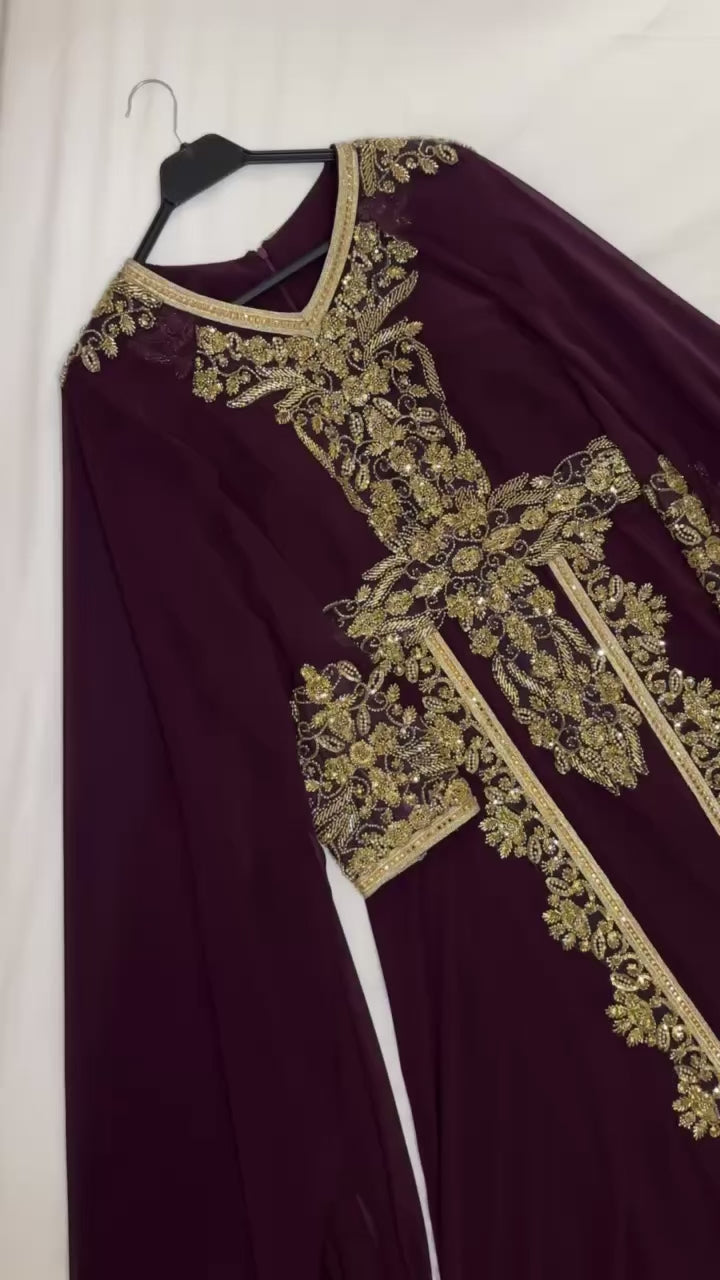 Almas (الماس) embodies a serene, ethereal elegance - the kind of beauty that appears softly yet leaves a lasting impression. Step into elegance with this sophisticated kaftan dress featuring delicate gold embellishment along the neckline, sleeves, and front for a refined, timeless look. The loose fit and flowy cape offer effortless and graceful movement. The belt adjusts perfectly to your body for a flattering fit.